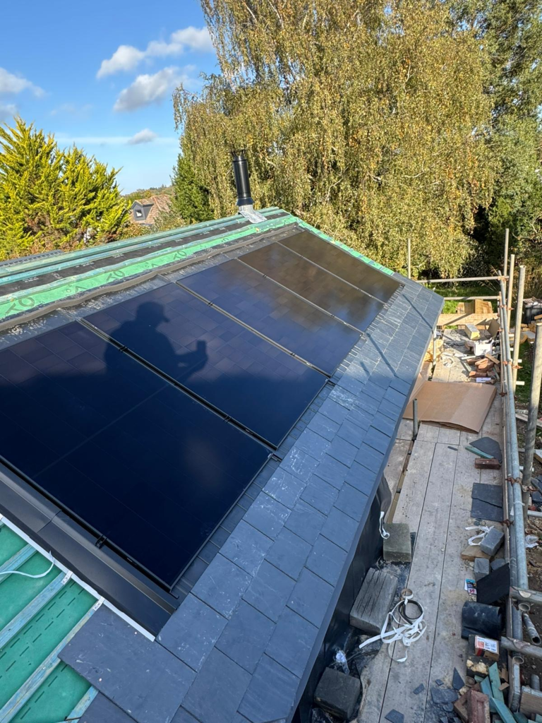 For this new build project, we installed a GSE in-roof mounting system, allowing the solar panels to sit flush within the roofline rather than mounted on top of tiles.